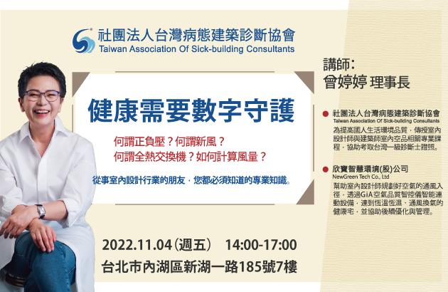 健康需要數字守護 由欣寶智慧環境創辦人,同時也是台灣病態建築診斷協會理事長曾婷婷主講,身為設計師的你想了解怎麼規劃健康宅?